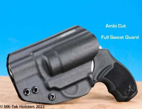 This holster is very well designed. Revolvers are often difficult to revolver but this one funnels the cylinder inside. The design is ambidextrous but also has as generous sweat guard. I like it a lot.